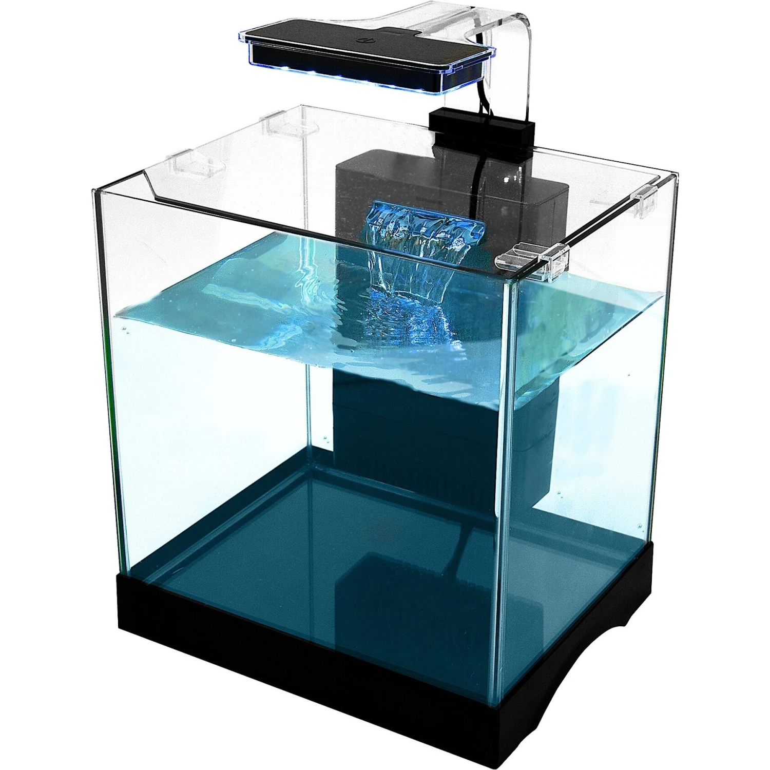 - Includes a glass tank, a crystal clear lid, an internal filter, and an array of blue and white LED lights.