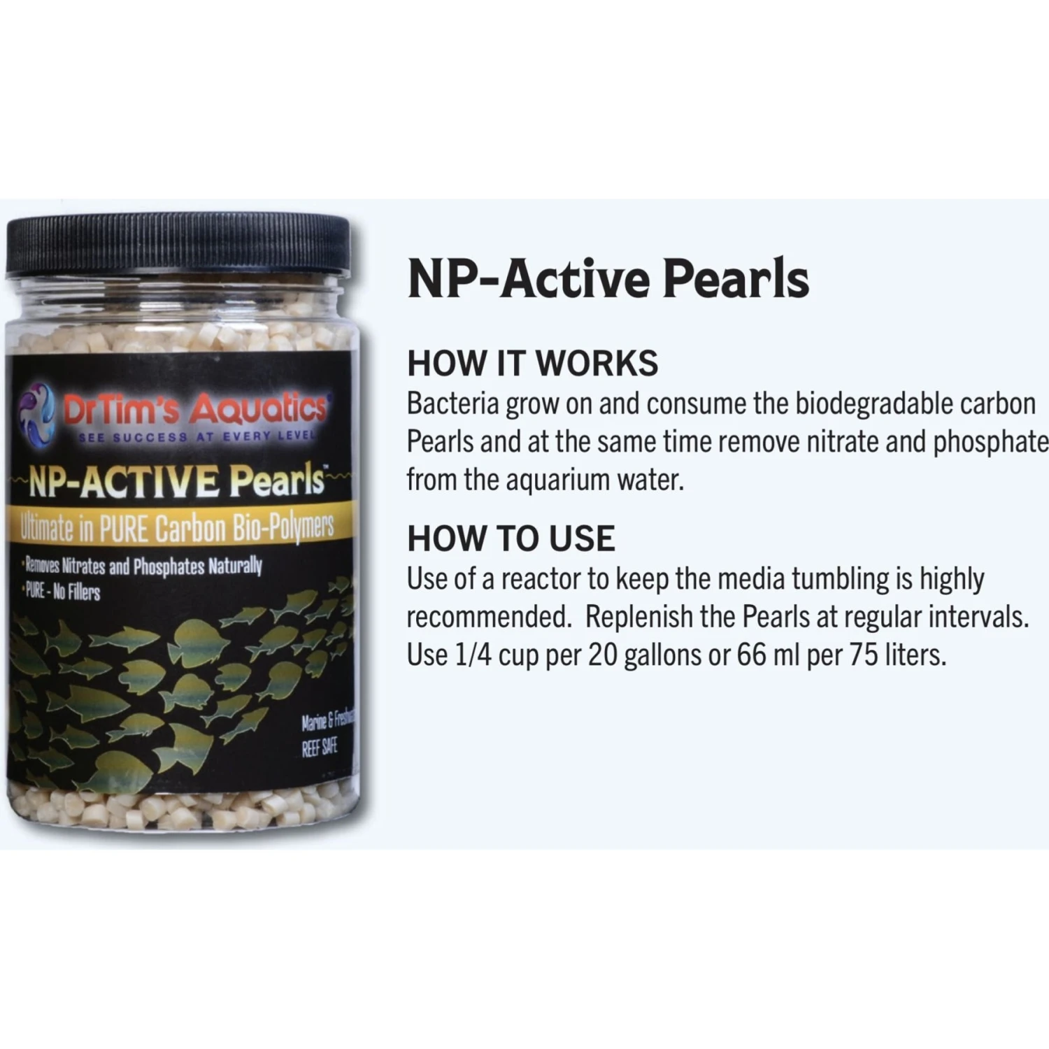 - Pure 100% biodegradable PHA-based carbon bio-polymers which are designed and have been tested for aquatic systems. The pearls act as a carbon source for the growth of beneficial bacteria, resulting in the removal of nitrate and phosphate from the water.