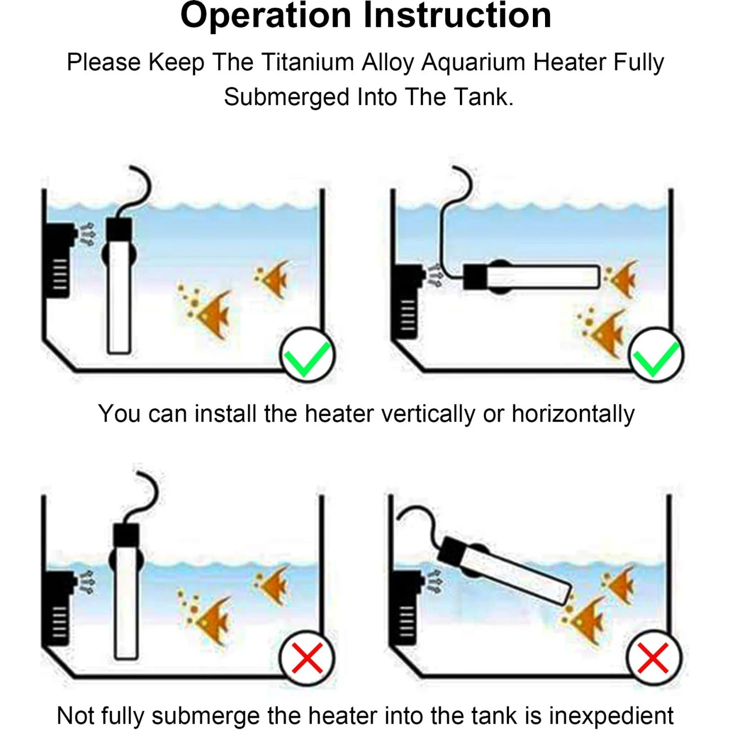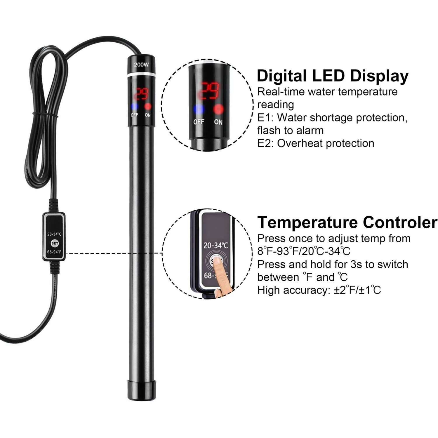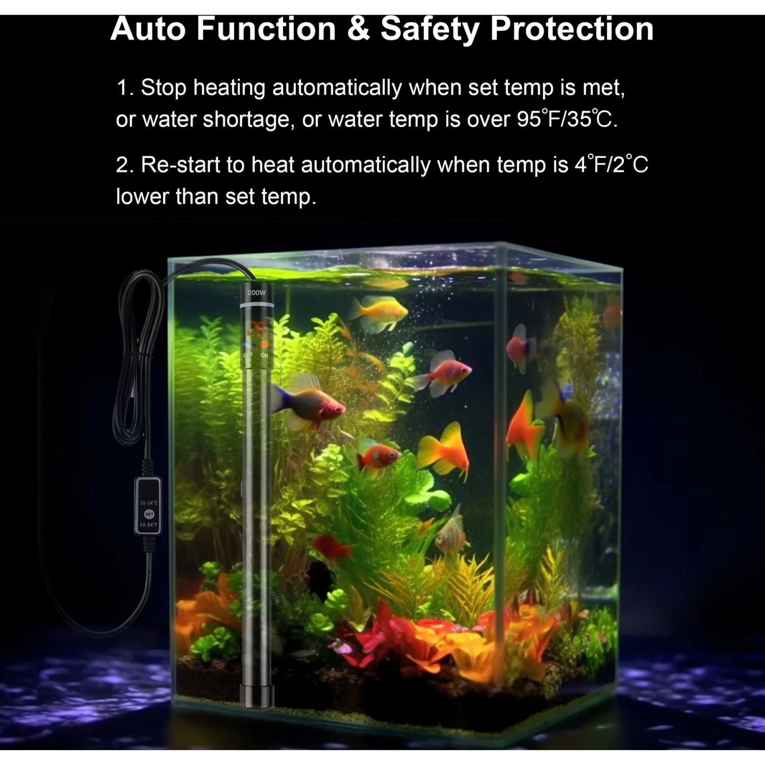 - 200-watt aquarium heater fits 50-60 gallon large fish tanks.