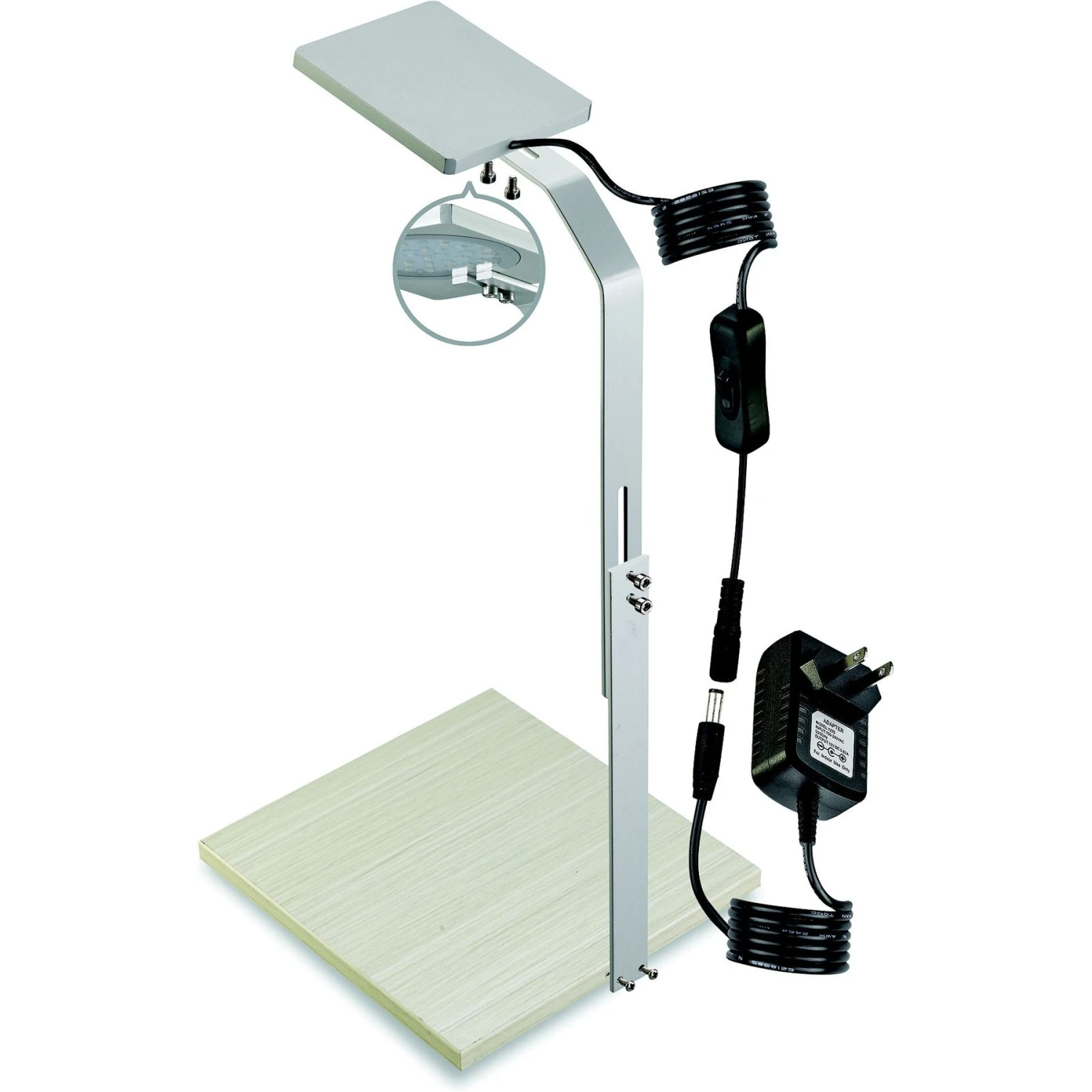 - Created with a bleached wood-tone base and aluminum light fixture that blends seamlessly into any environment.