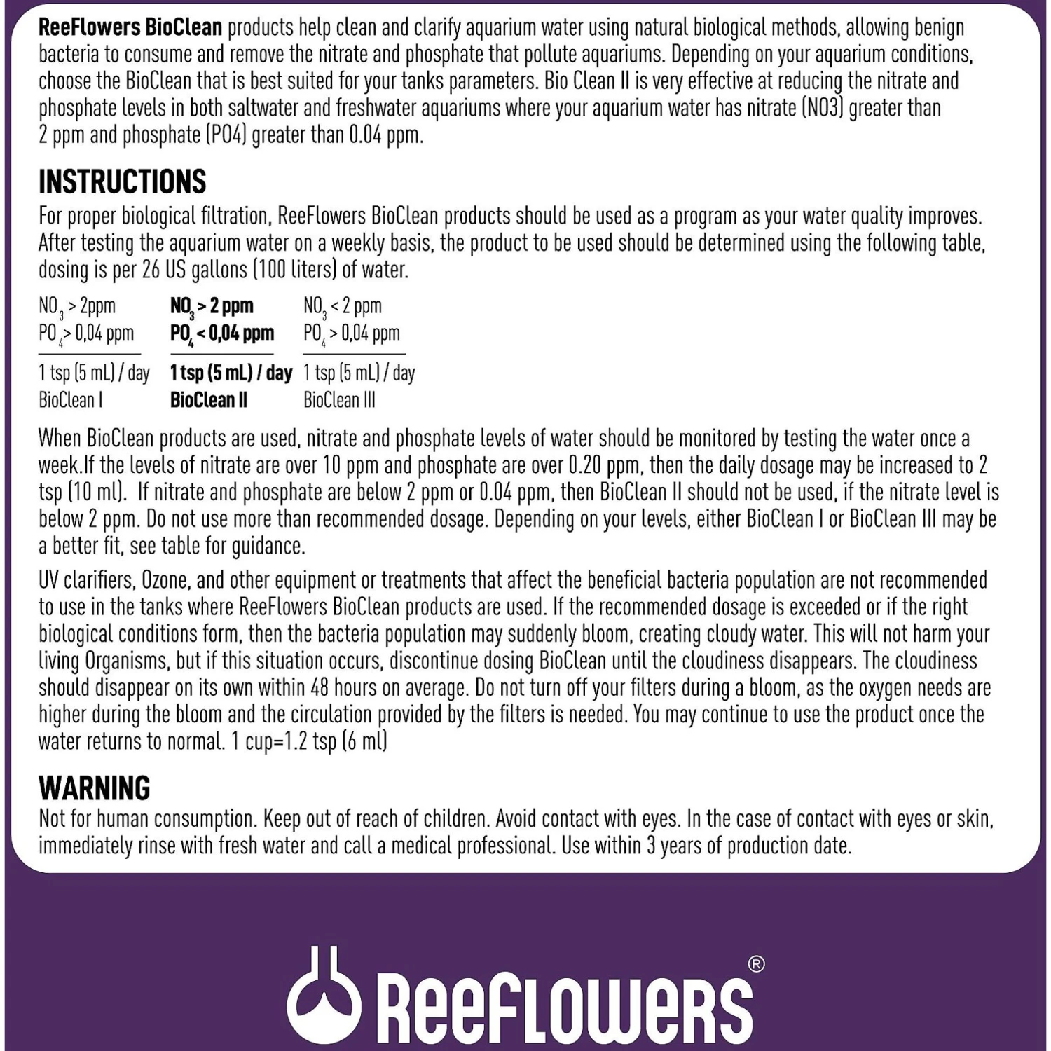When BioClean products are used, nitrate and phosphate levels of water should be monitored by testing the water once a week. If the levels of nitrate are over 10 ppm and phosphate are over 0.20 ppm, then the daily dosage may be increased to 2 tsp (10 mL). If nitrate and phosphate are below 2 ppm or above 0.04 ppm, respectively, then BioClean II should not be used. Depending on nitrate and phosphate levels, either BioClean I or BioClean III should be used per the table above. UV clarifiers, Ozone, and other equipment or treatments that affect the beneficial bacteria population are not recommended to use in tanks where ReeFlowers BioClean products are used. If the recommended dosage is exceeded or if the right biological conditions form, then the bacteria population may suddenly bloom, creating cloudy water. This will not harm your living organisms, but if this situation occurs, discontinue dosing BioClean until the cloudiness disappears. The cloudiness should disappear on its own within 48 hours on average. Do not turn off your filters during a bloom, as the oxygen needs are higher during the bloom and the circulation provided by the filters is needed. You may continue to you the product once the water returns to normal.