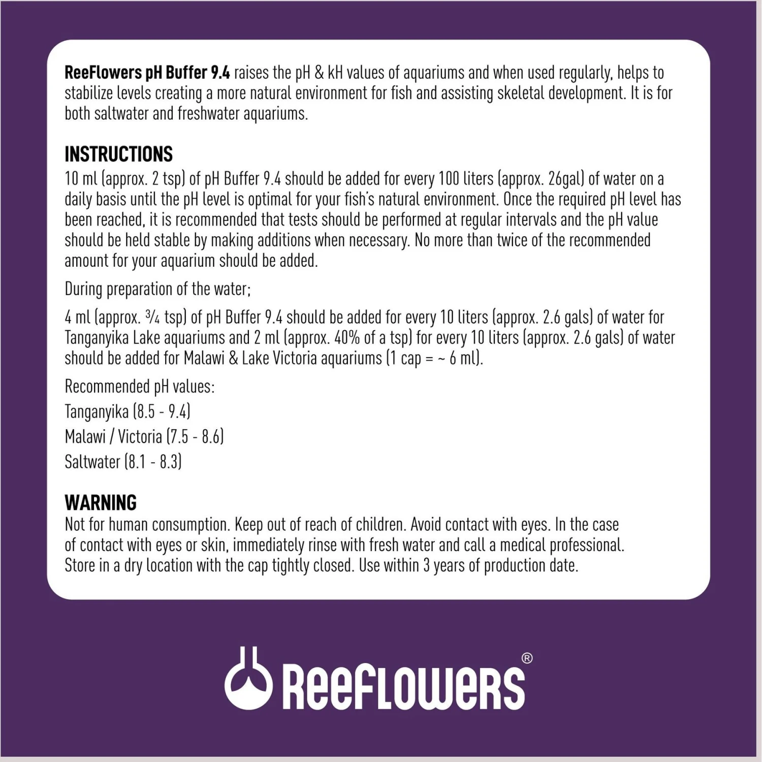 Keep your tank healthy, thriving and beautiful with Reeflowers pH Buffer 9.4 Fish Aquarium Water Conditioner! Crafted to help maintain a high pH level, make sure to use this formula with each water change to stabilize the pH. This creates a more natural environment, perfect for your South American cichlids, while assisting with skeletal development. Use it regularly in your freshwater or saltwater tank.