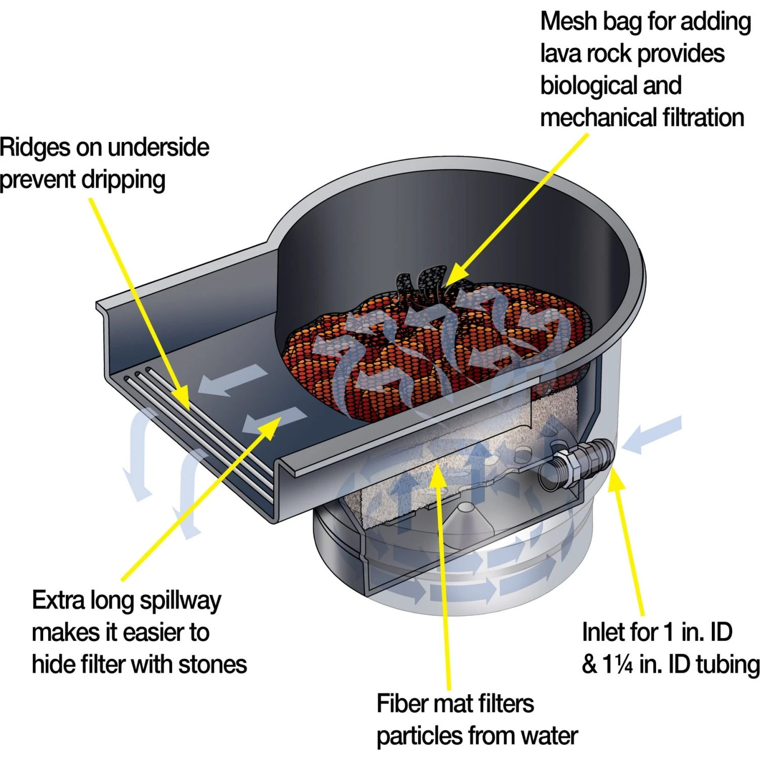 - Extra-long spillway disguises filter easily—it virtually disappears in your landscape.