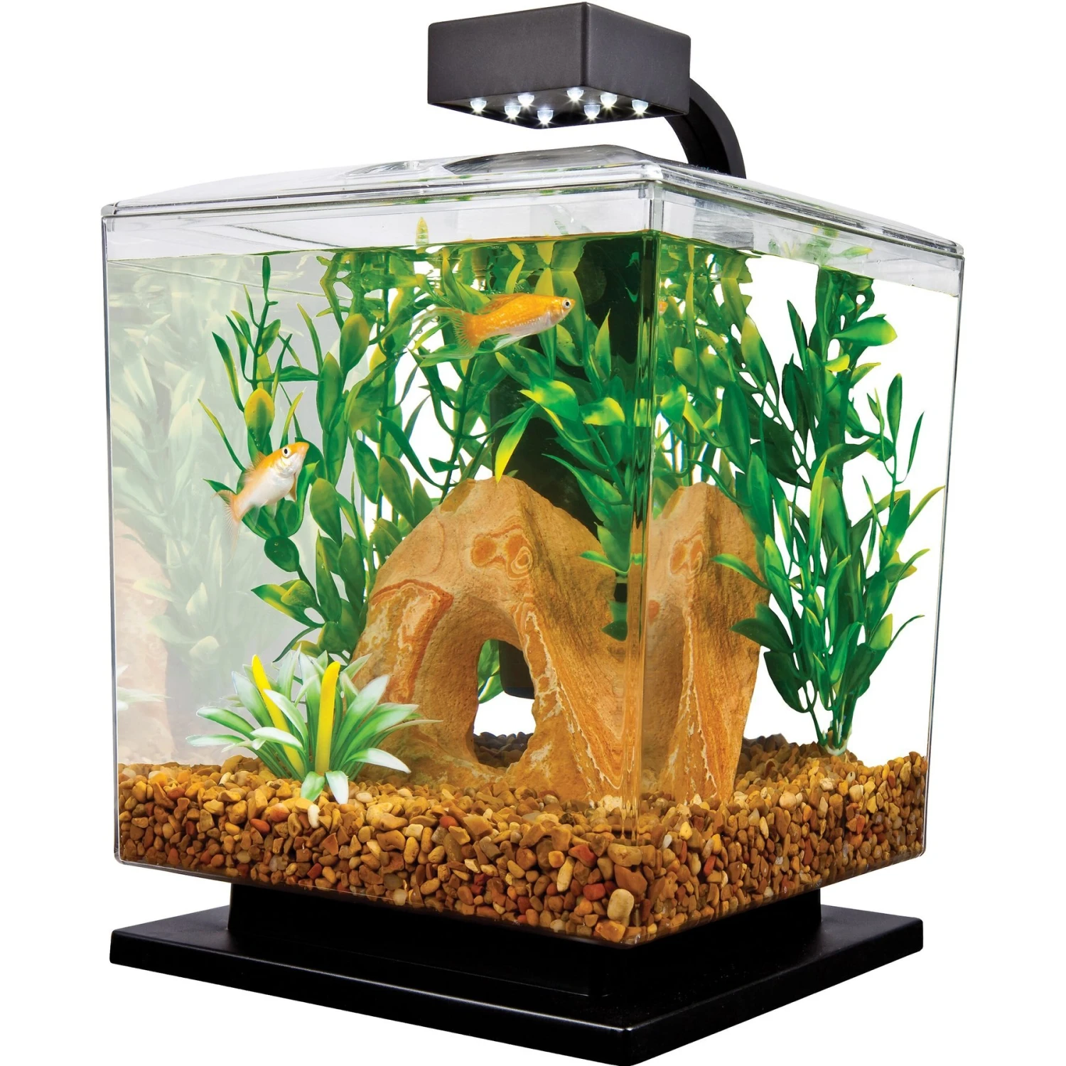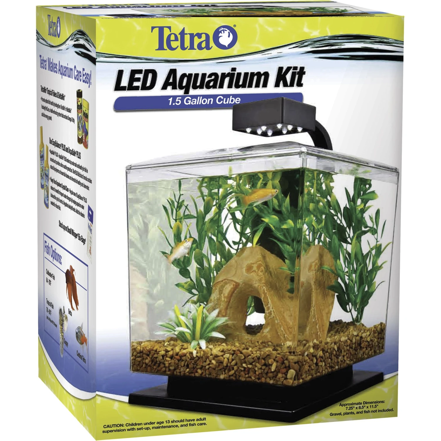 - Includes a seamless aquarium, a clear cover, a unique black base, elevated, overhead LED lights, and a Tetra Whisper filtration unit